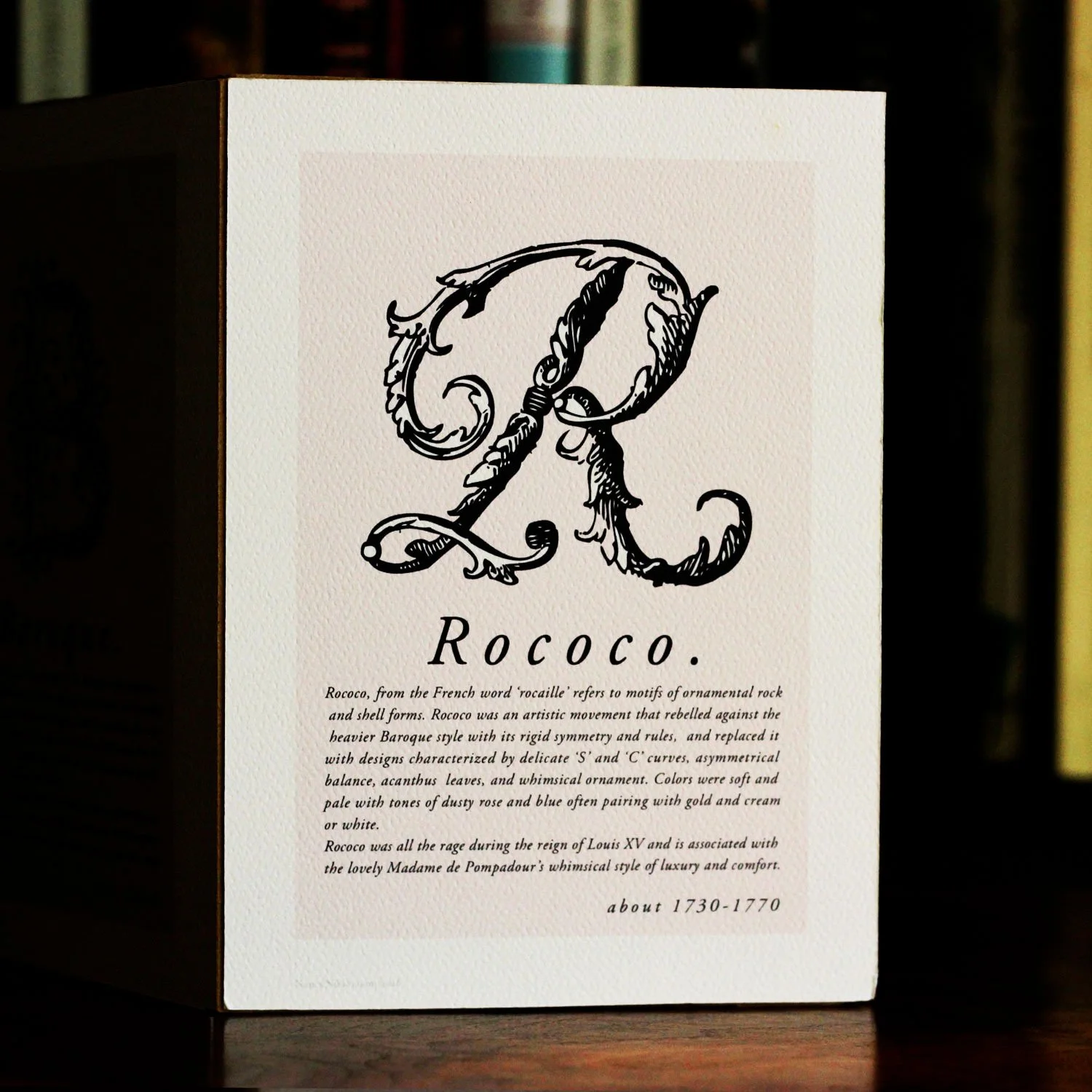 “Rococo, from the French word Rocaille, refers to rock and shell forms, and was an artistic movement that rebelled against the earlier and heavier Baroque style.”